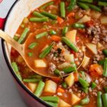 Remove and discard the bay leaves and Parmesan rind. Stir in the cooked ground beef and chopped green beans (tips removed). Simmer for another 5-10 minutes, or until the green beans are tender.