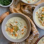 To finish the soup, add the shredded chicken back to the soup and add the zest of one lemon and lemon juice, whole milk, cream, and fresh dill— bring the soup back up to temp and season with more salt and pepper to taste and enjoy!
