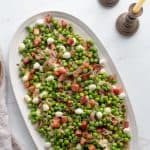 Peas and pancetta – fun to say, easy to make, delicious to eat! This astonishingly simple side dish combines sweet peas, salty pancetta, and creamy mozzarella in an elegant presentation that comes together in under 20 minutes.